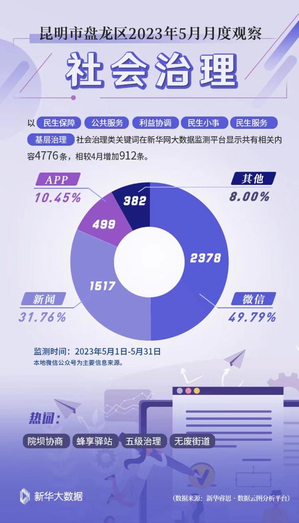 在“社會治理”主題中,以“民生保障”“公共服務”“利益協調”“民生小事”“民生服務”“基層治理”等關鍵詞在新華網大數據監測平臺進行綜合搜索、整理、分析、研判,共梳理出有效傳播數據內容4776條。其中,院壩協商、蜂享驛站、五級治理、無廢街道成為媒體關注的熱詞。