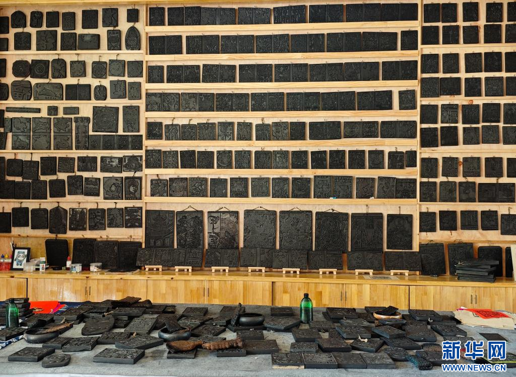 掛滿整面墻壁與鋪滿桌面的甲馬刻版(6月16日攝)。新華網發(劉東 攝)