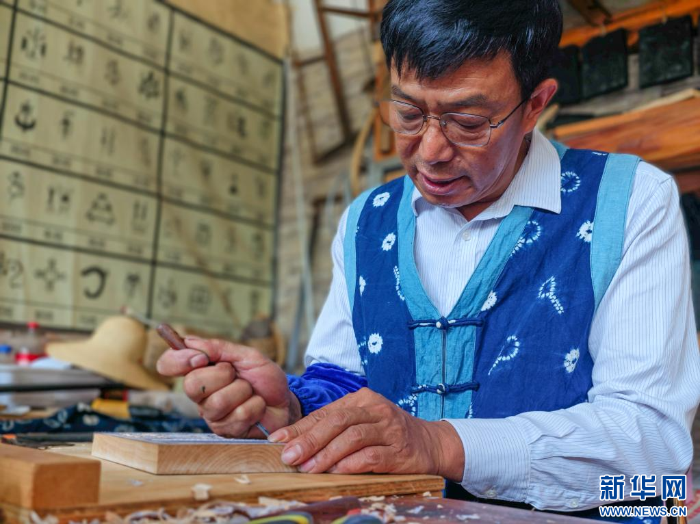 張瑞龍正在制作白族甲馬刻版(6月16日攝)。新華網發(劉東 攝)