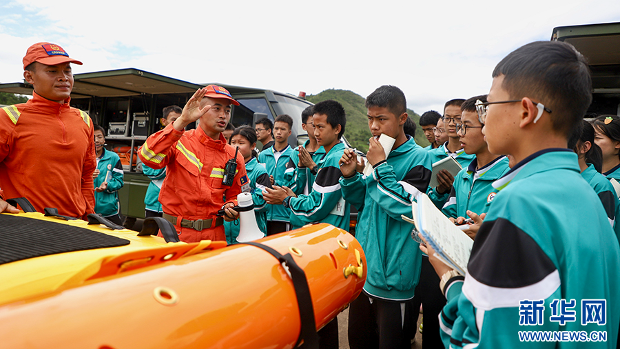 森林消防員向學生們展示水域救援裝備(攝于6月29日)。新華網發(云南省森林消防總隊保山支隊供圖)