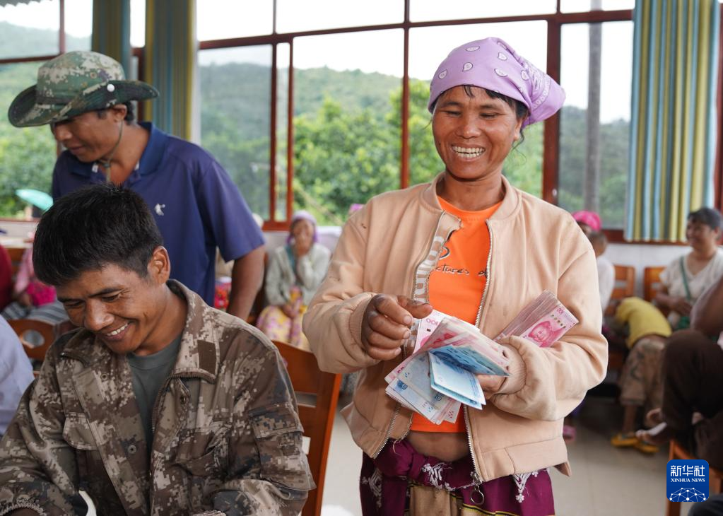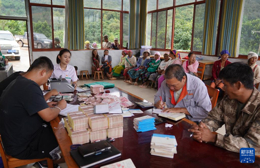 7月7日,村民在云南省普洱市孟連傣族拉祜族佤族自治縣富巖鎮金山咖啡專業合作社領取分紅。新華社發(梁志強 攝)