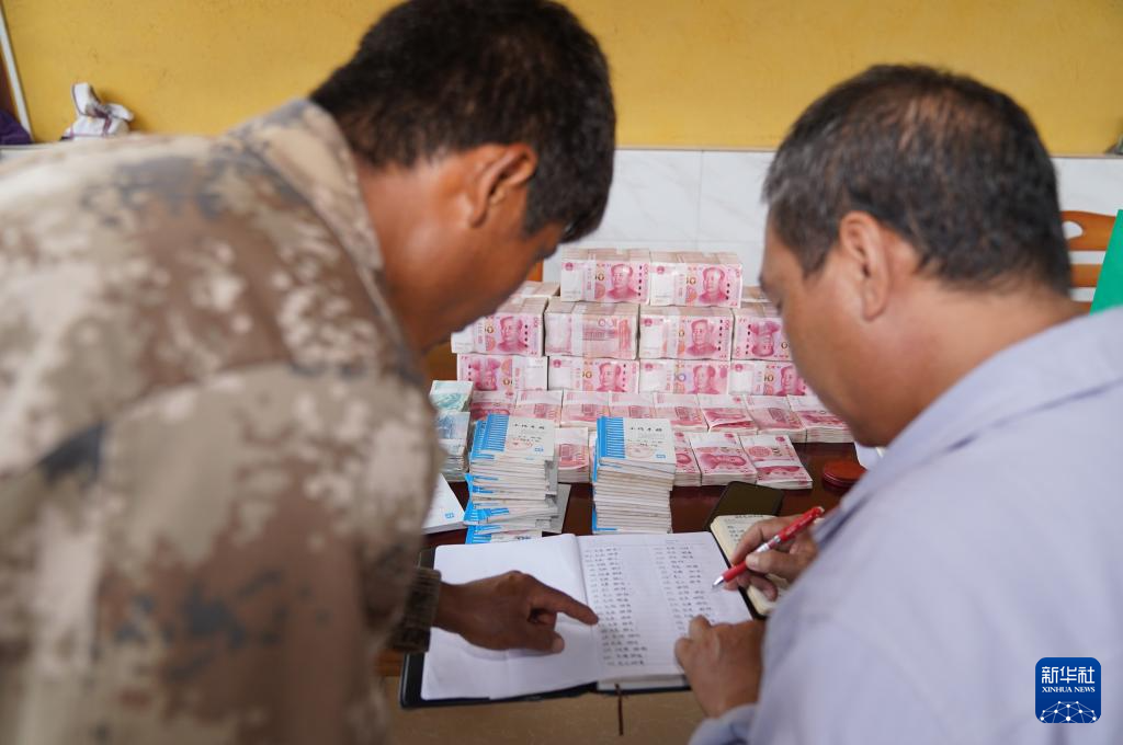 7月7日,村委會工作人員(右)在云南省普洱市孟連傣族拉祜族佤族自治縣富巖鎮金山咖啡專業合作社為村民登記分紅金額。新華社發(梁志強 攝)