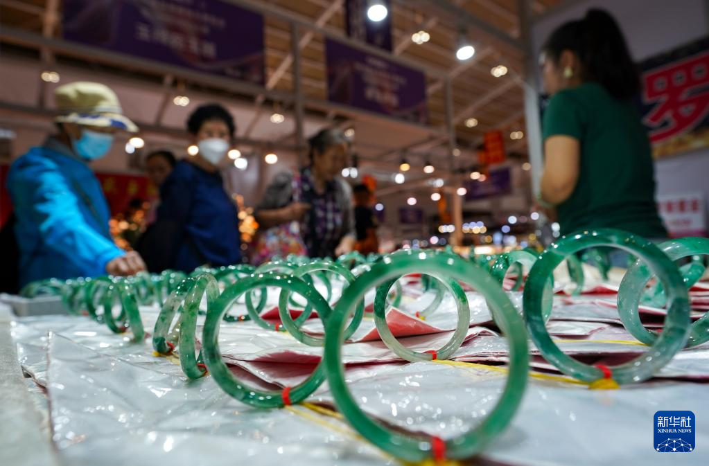 7月6日,參觀者在石博會上選購翡翠手鐲。新華社記者 陳欣波 攝