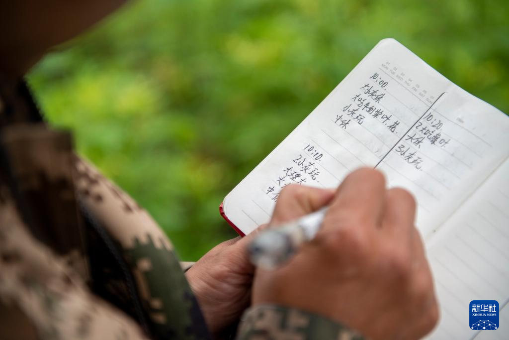 7月8日,在高黎貢山國家級自然保護區,一名巡護隊員記錄觀察到的猴群活動信息。