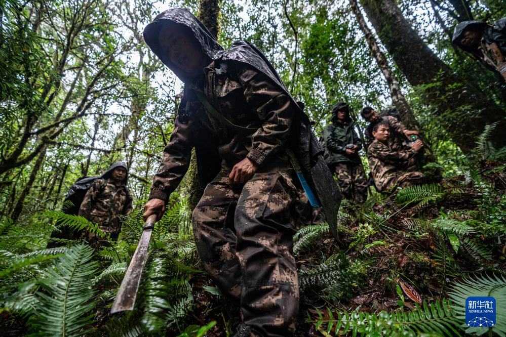 7月9日,在高黎貢山國家級自然保護區,巡護隊員清理紅外相機附近的雜草。