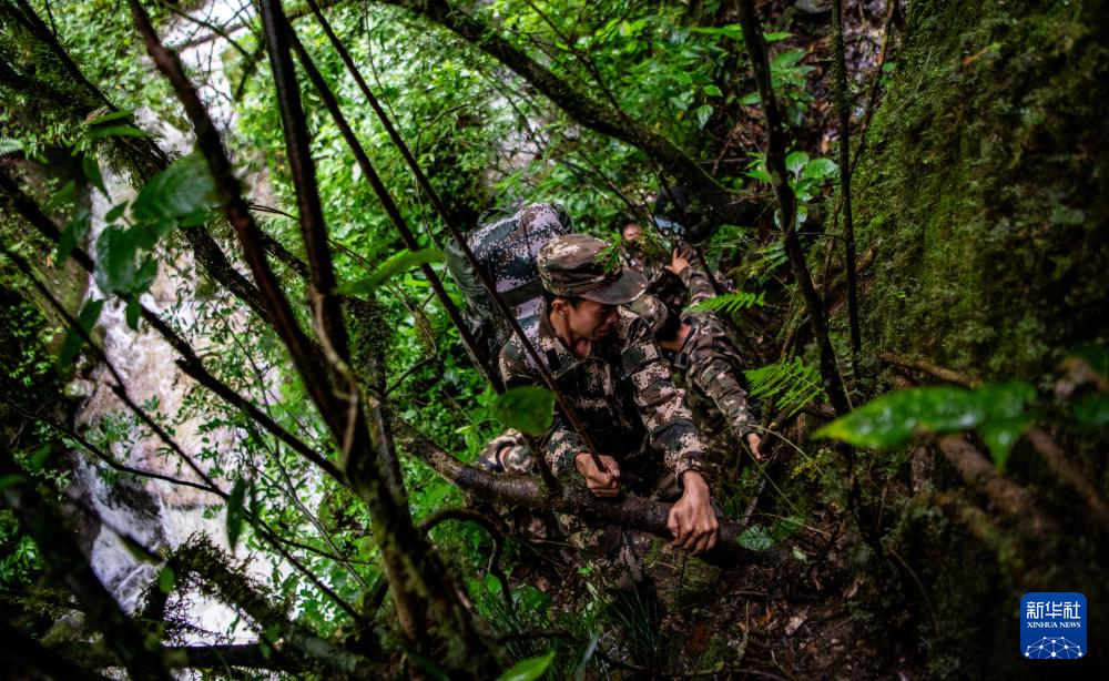 7月8日,在高黎貢山國家自然保護區,巡護隊員抓著樹根順著接近90度的懸崖慢慢滑下。
