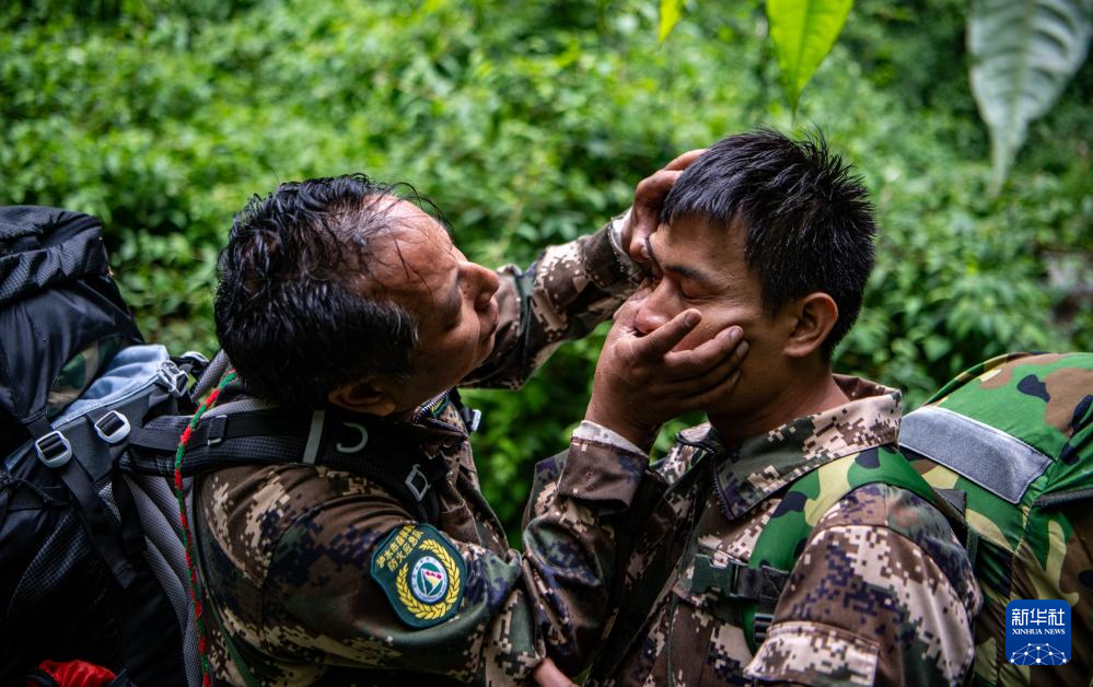 7月8日,在高黎貢山國家級自然保護區,何貴品(左)在檢查巡護隊員受傷的眼睛。