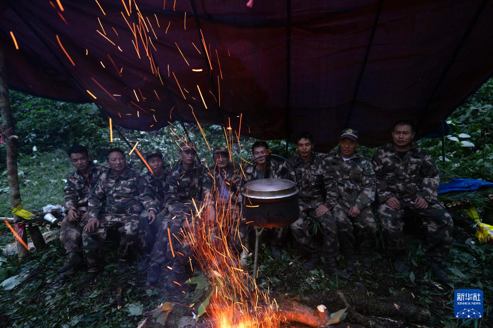 7月8日,在高黎貢山國家自然保護區,巡護隊員在篝火旁休息。