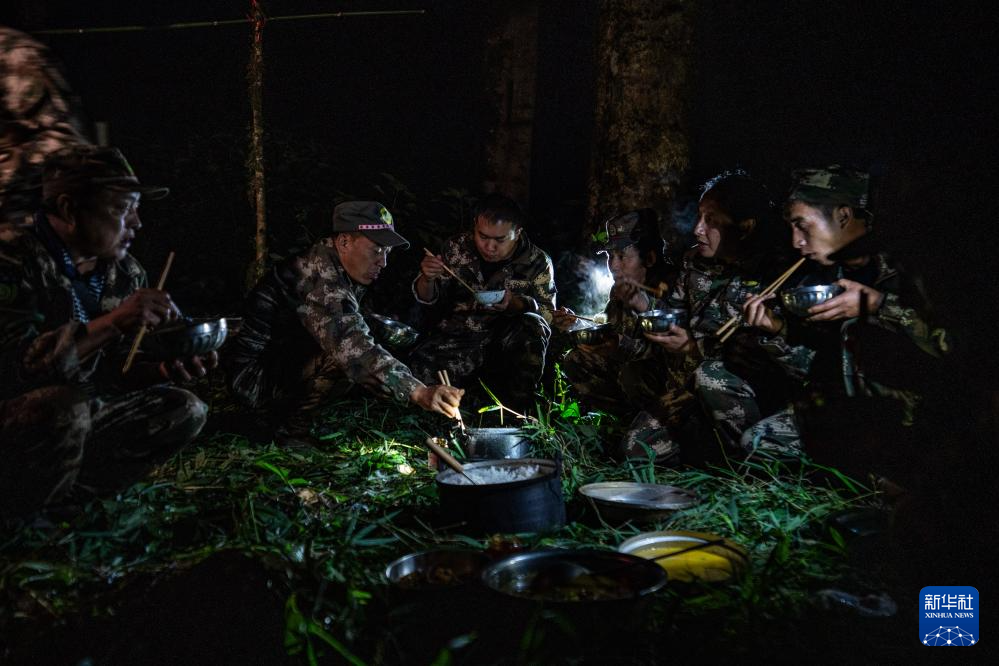 7月8日,在高黎貢山國家自然保護區,巡護隊員在吃晚飯。
