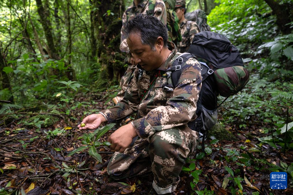 7月8日,在高黎貢山國家級自然保護區,何貴品(前)拾起一顆怒江金絲猴最愛吃的山香果。