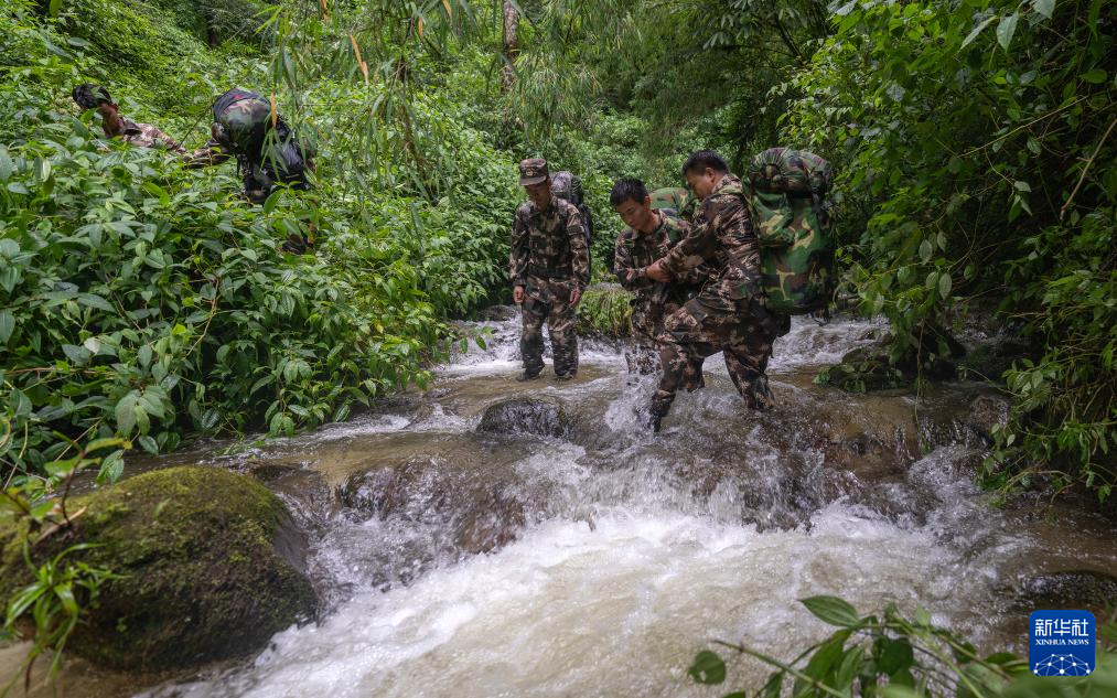 7月8日,在高黎貢山國家級自然保護區,巡護隊員互相幫助蹚過湍急的溪流。