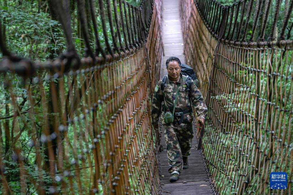 7月8日,何貴品穿過高黎貢山鹽馬古道上的索道橋,準備進山巡護。