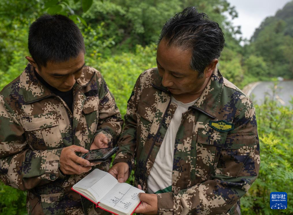7月8日,何貴品(右)在查看護林員喬新華記錄的菲氏葉猴的行動軌跡。