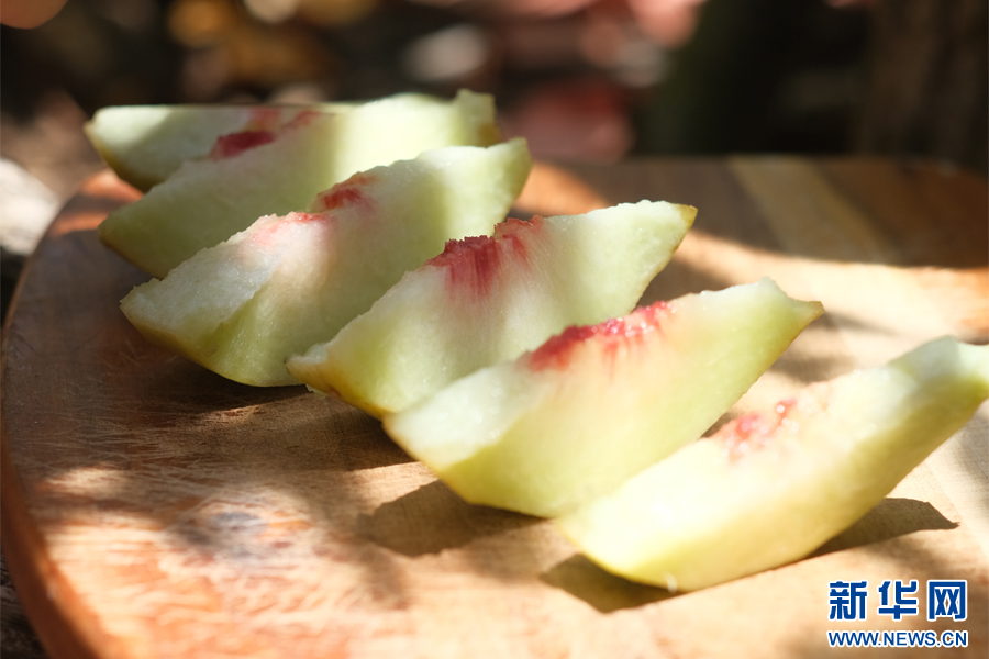 新鮮切開的鷹嘴桃(7月4日攝)。新華網發(張玨 攝)