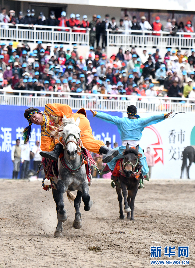 選手正在進行馬術動作表演(6月22日攝)。新華網發(迪慶日報社 供圖)