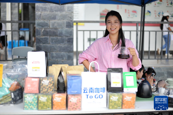 羅怡在普洱舉辦的咖啡市集上推薦自家生產的咖啡豆(資料照片)。新華社發