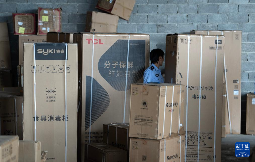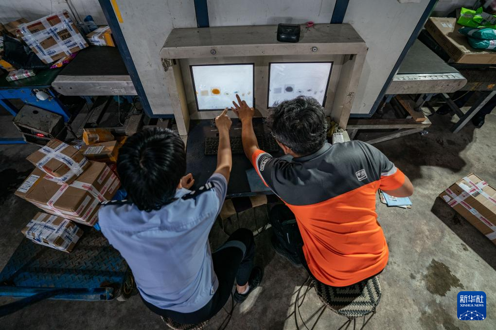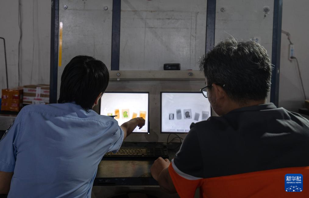 7月12日,尹銘燕(左)和同事在芒市一處物流點對快遞包裹進行查緝。