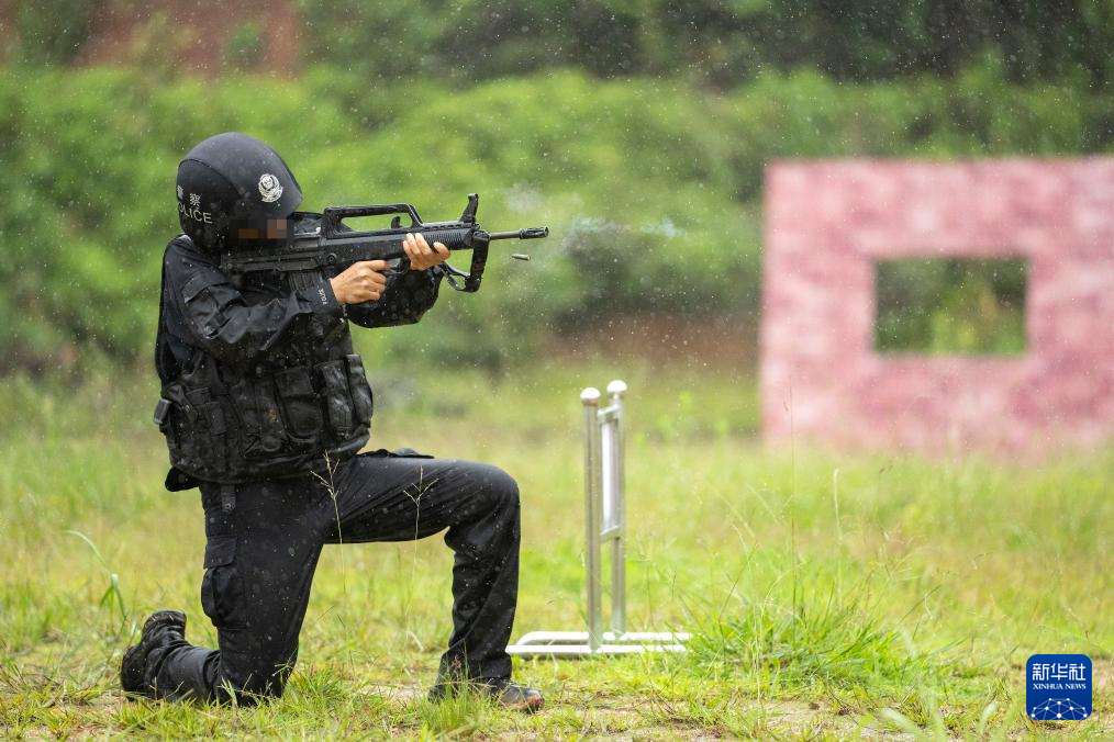 7月13日,尹銘燕在進行射擊訓練,地面的水洼映出她的倒影。