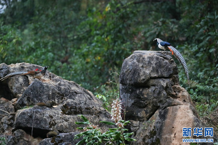 白腹錦雞和松鼠同框(7月7日攝)。新華網發( 尹磊 攝)
