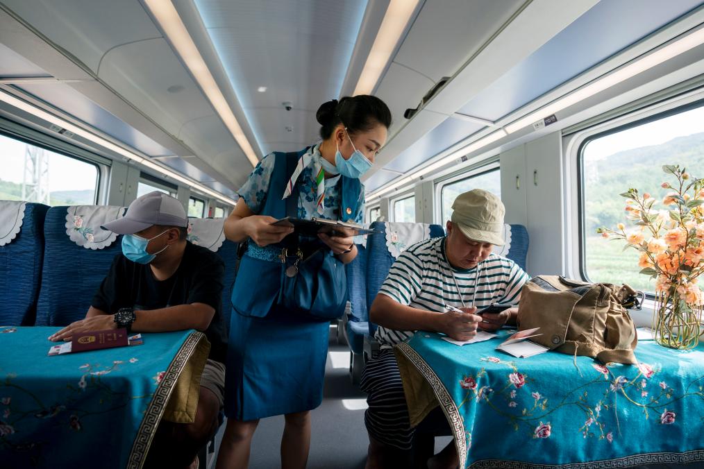 ↑依波逢(中)在D887次列車上協助出境旅客填寫出境信息表(7月16日攝)。