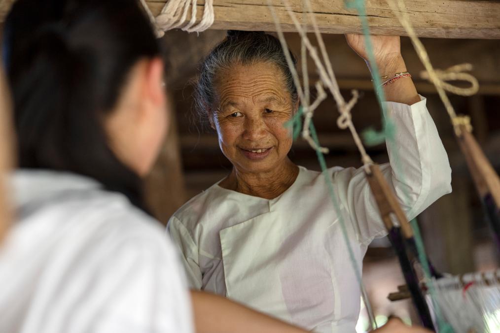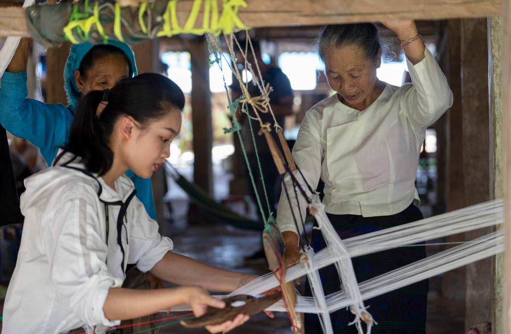 ↑7月16日,依波逢的外婆(右)指導依波逢織布。