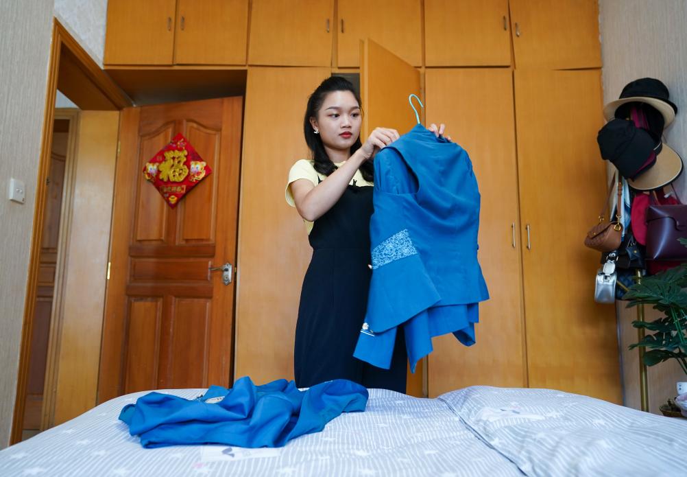 ↑依波逢在位于昆明的住處整理工作服(7月15日攝)。