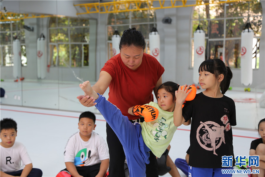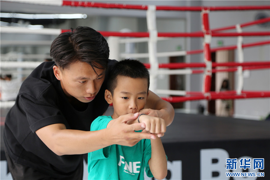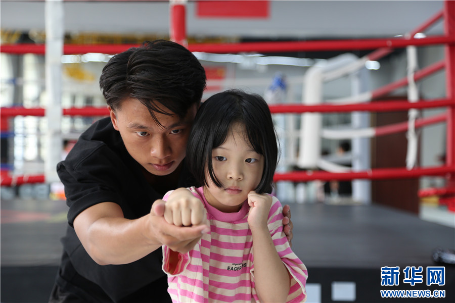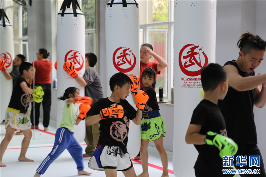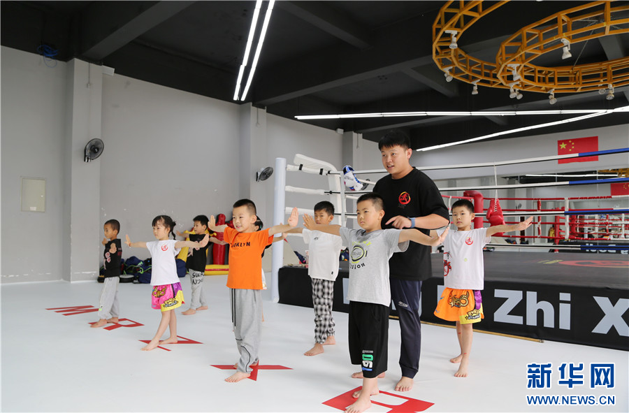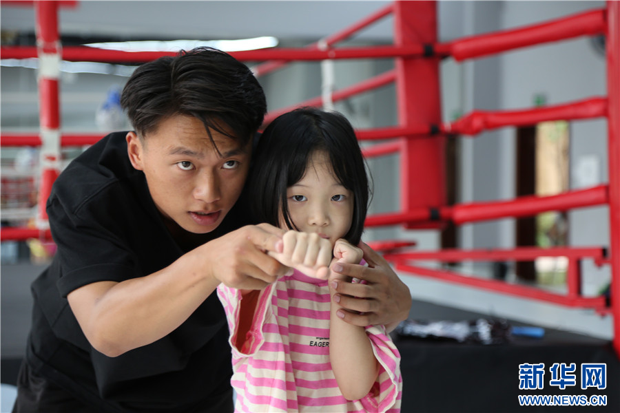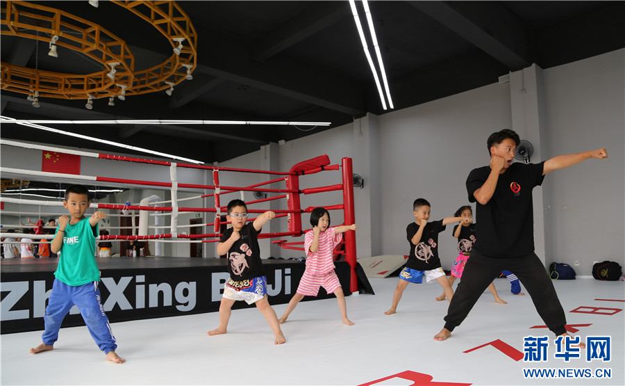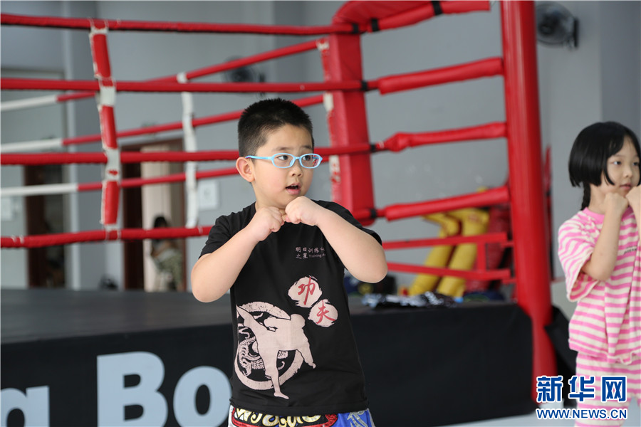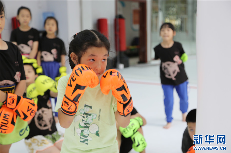 7月16日,孩子們在云南省紅河州青少年宮搏擊運動館學習搏擊。新華網發(薛瑩瑩 攝)