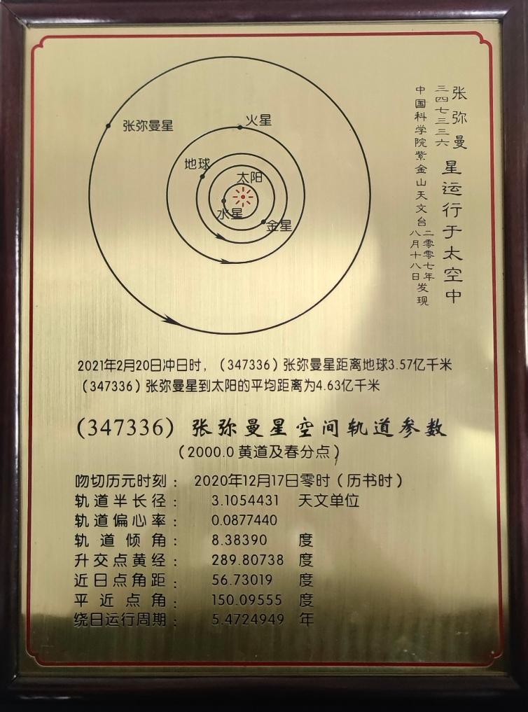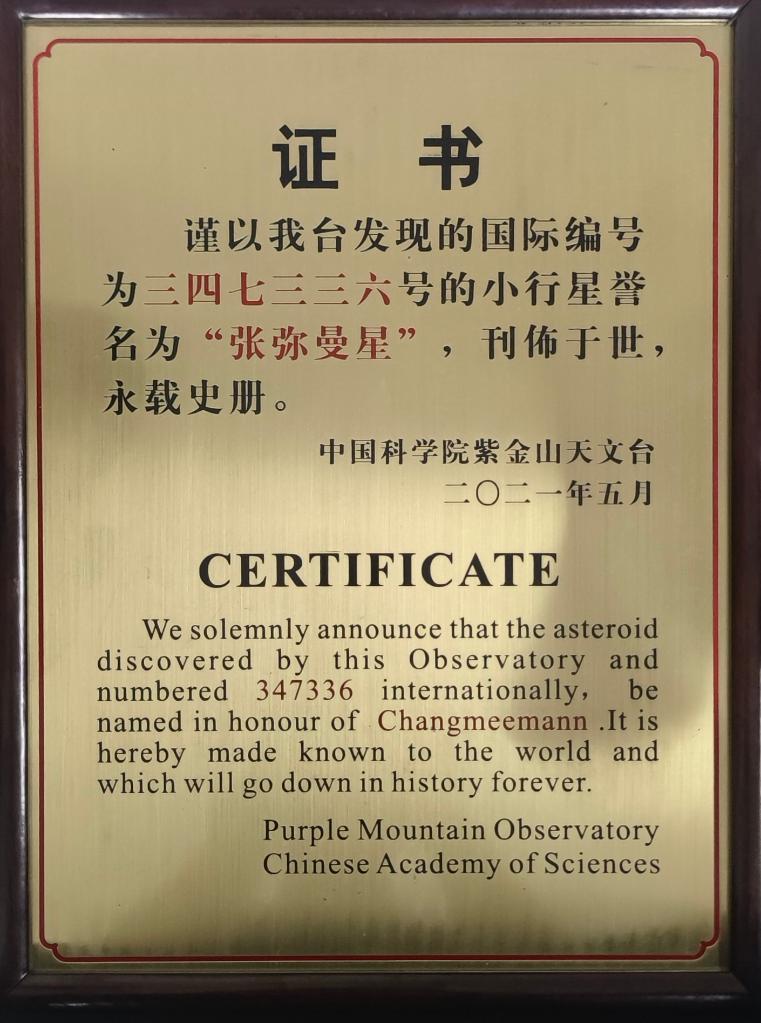 7月19日,“張彌曼星”命名儀式在云南曲靖舉行。經國際小行星命名委員會批準,由中國科學院紫金山天文臺發現、國際編號為347336號的小行星被正式命名為“張彌曼星”。