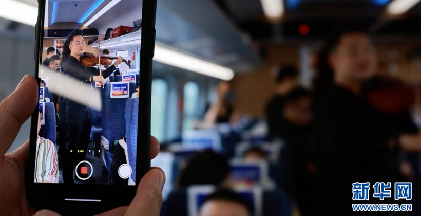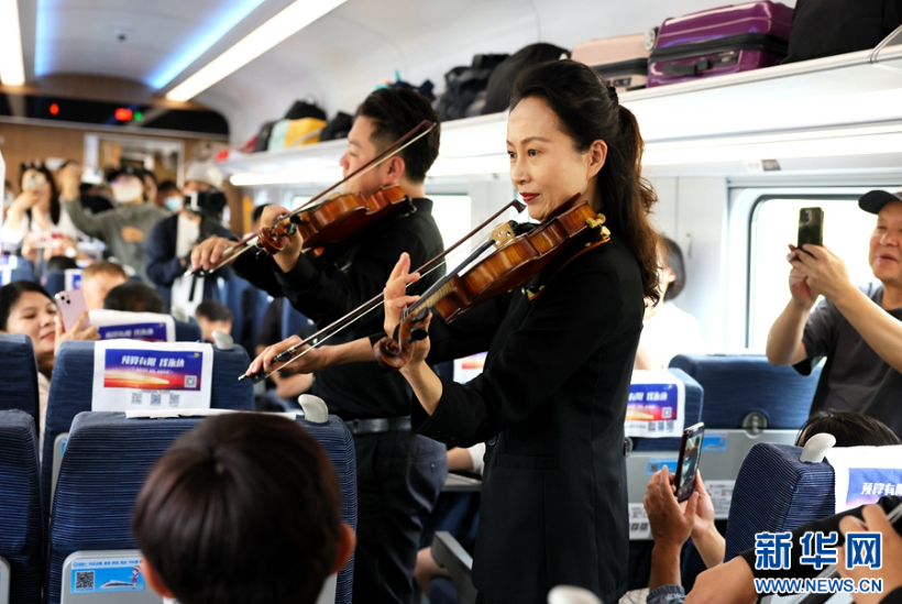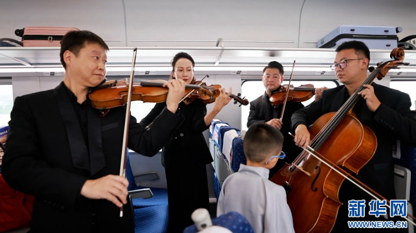 7月19日上午,來自昆明聶耳交響樂團的9名演奏家“閃現”中老鐵路C303次列車4號車廂,傾情演奏了《在希望的田野上》《絨花》《唱支山歌給黨聽》等著名曲目,循聲而來的乘客們紛紛跟著熟悉的旋律哼唱起來,車廂里歌樂相和,一片歡騰。