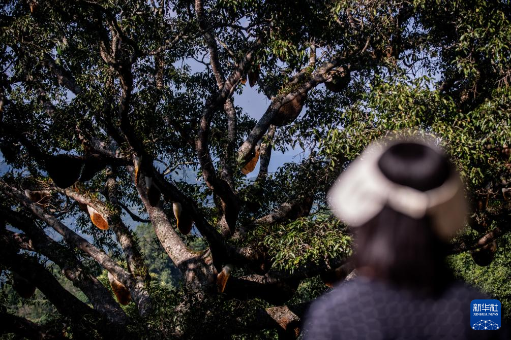 游客在瀾滄縣景邁山參觀一棵枝干上筑有數十個蜂巢的榕樹,當地也稱此樹為“蜂王樹”(7月18日攝)。
