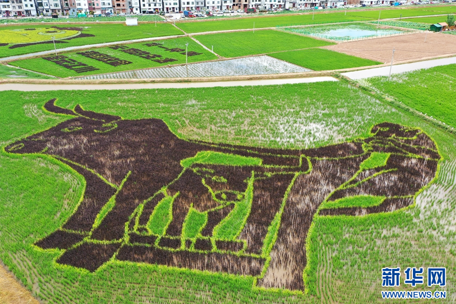 除“?;~案”外,玉溪市江川區的稻田畫還呈現了“大頭魚”圖案(攝于7月11日)。新華網發(李丹 攝)