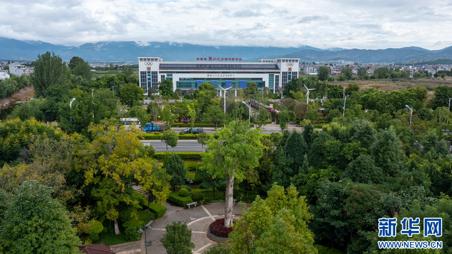 航拍視角下的彌渡縣全民健身中心一帶,植被繁茂,綠意盎然(攝于7月14日)。新華網 趙普凡 攝