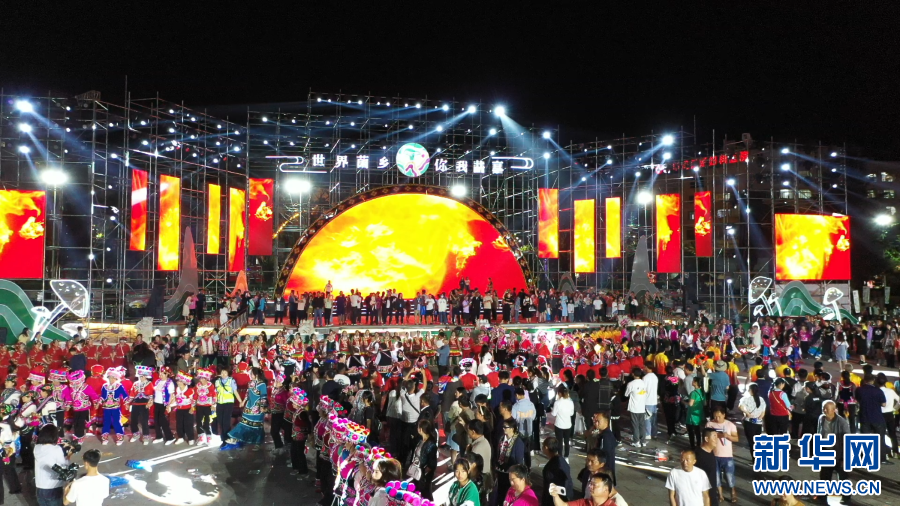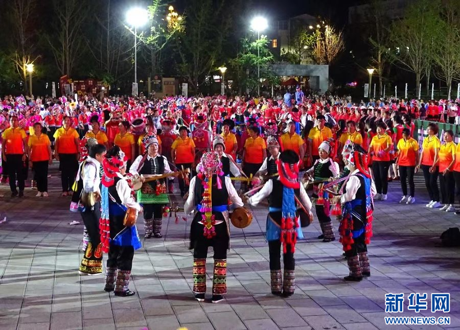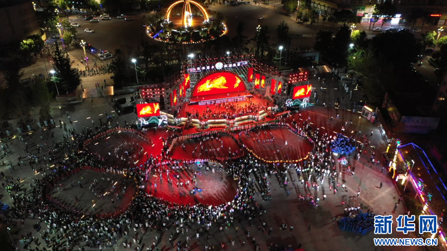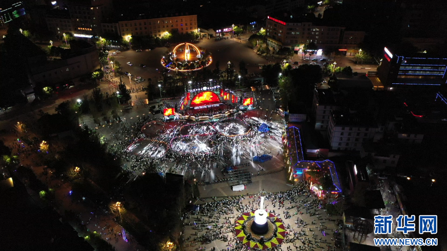 航拍多地群眾在南華縣齊跳民族歌舞狂歡現場(攝于8月4日)。新華網發(錢宇 攝)