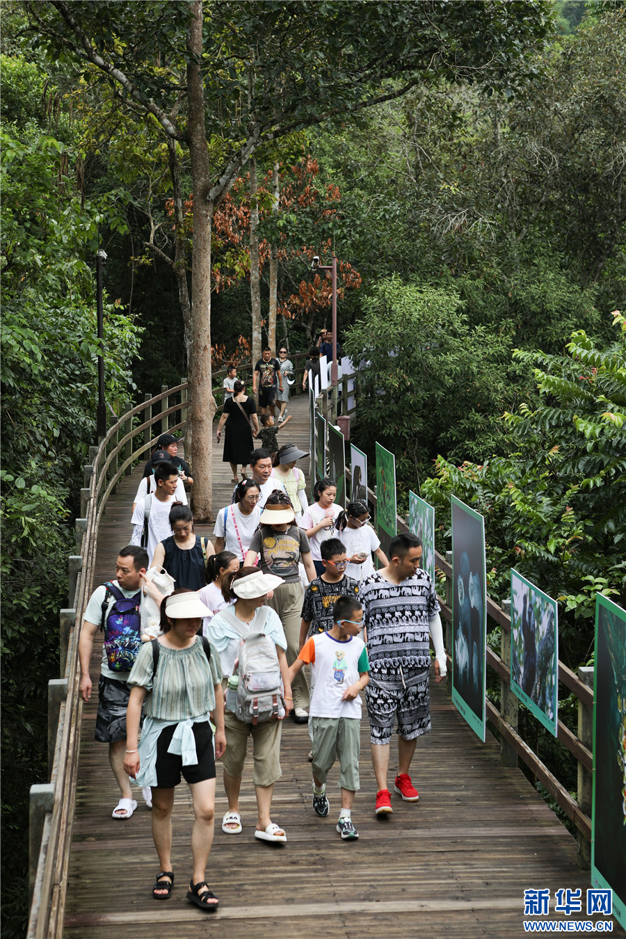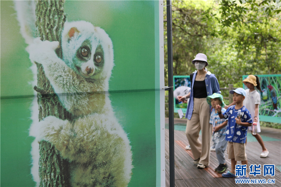 8月5日,游客在云南西雙版納野象谷景區觀光棧道上觀看展覽作品。