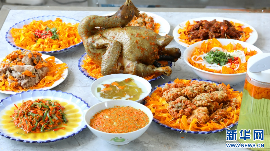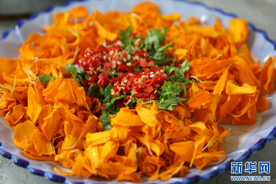 涼拌萬壽菊(8月3日攝)。新華網發(施甸縣融媒體中心供圖)