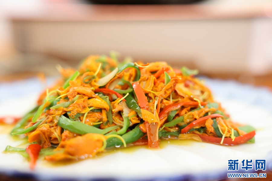 何元鄉盛產辣椒,辣椒與萬壽菊的搭配也使人眼前一亮。大蒜切片,辣椒、蔥白切絲,鍋中熱油放入青花椒、蒜片炒香,再放入辣椒絲、蔥絲、菊花瓣翻炒均勻,一道爆炒萬壽菊出鍋。