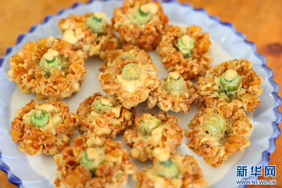 萬壽菊酥鮮、香、脆,洗凈的小朵菊花瀝干水分,打幾個雞蛋,放入胡椒粉、草果粉、蠔油、雞精、豌豆粉、小粉、香油,調成糊狀,小朵菊花放入面糊中,包裹成型,待油溫七成熱放進鍋中炸至金黃,讓你吃了一朵還想再吃一朵。