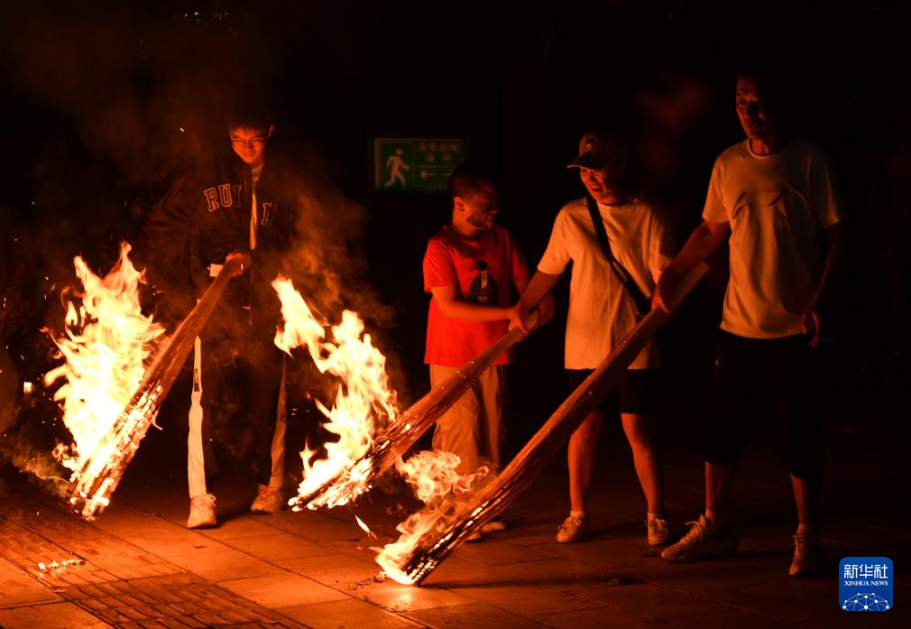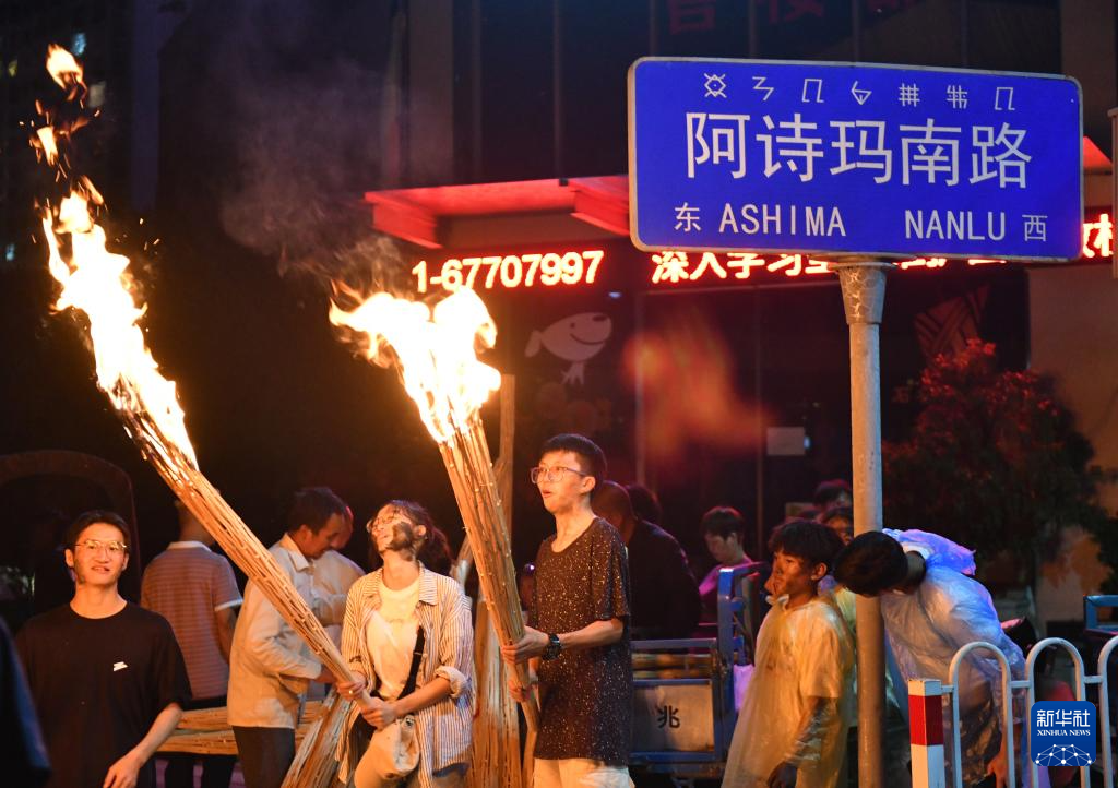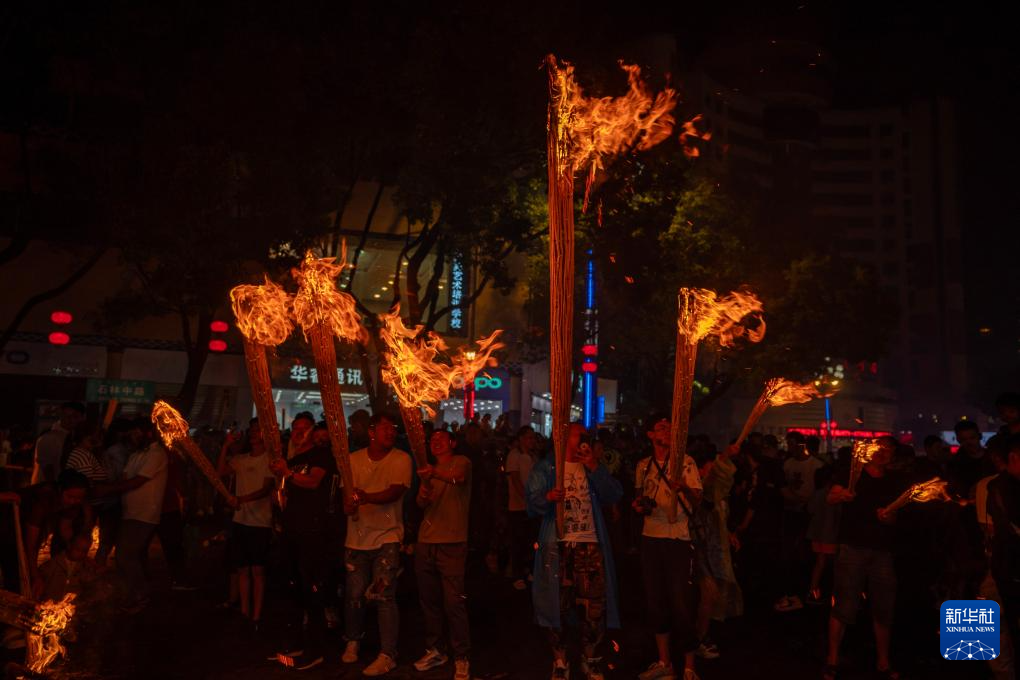8月10日晚,兩名年輕人舉著火把在歡慶火把節。