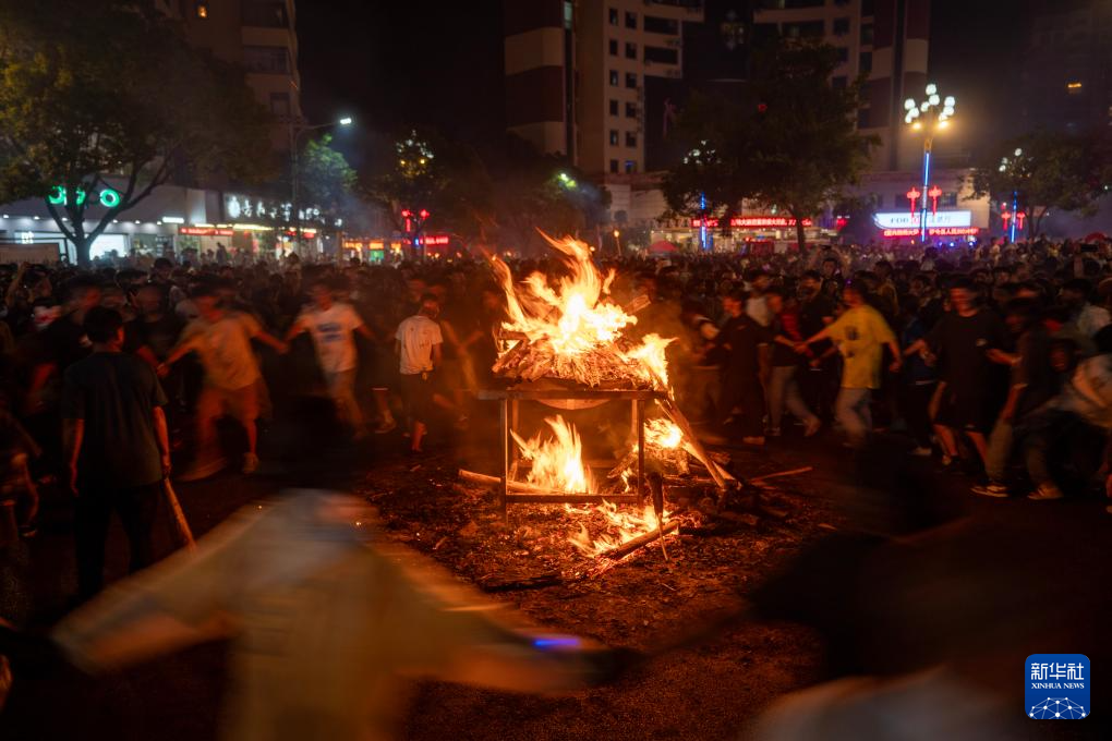 8月10日晚,石林當地彝族群眾與游客在歡慶火把節。
