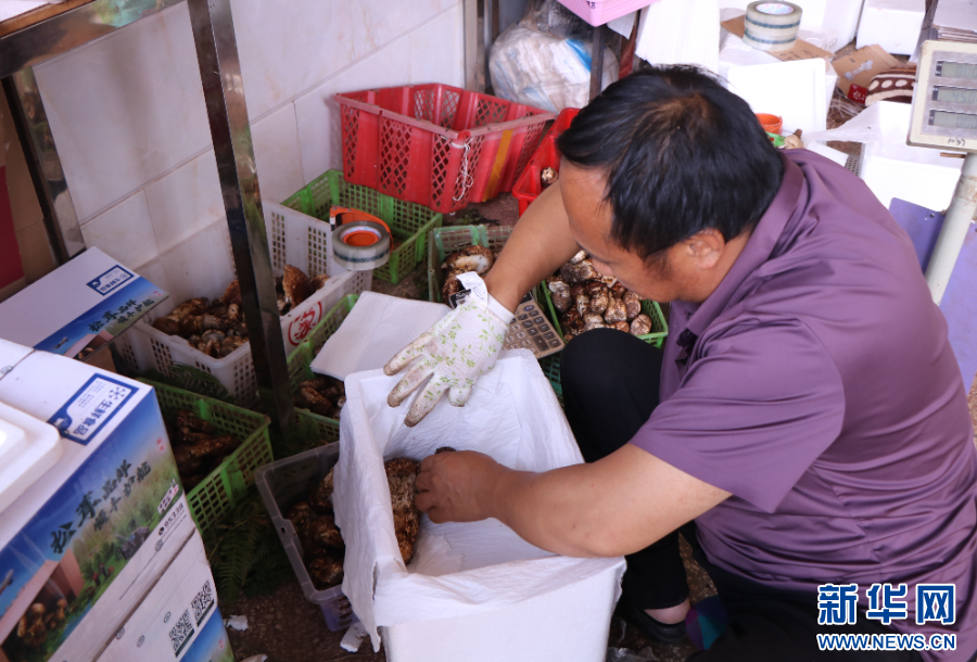 魯有勝正在打包松茸(8月14日攝)。新華網發(李婭潔 攝)