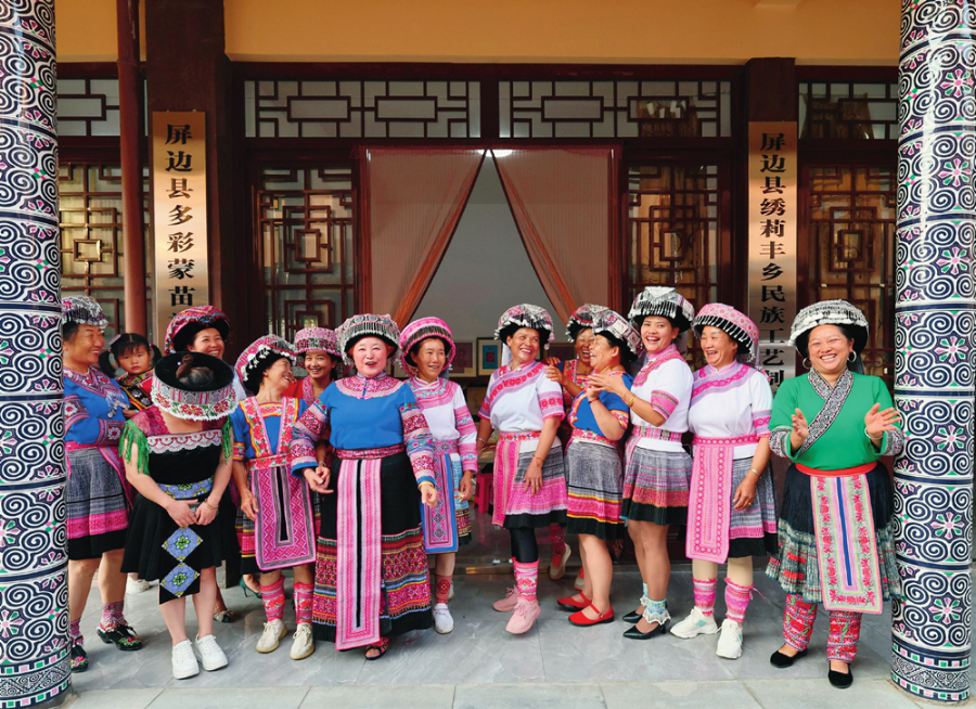 云南省屏邊苗族自治縣繡娘在屏邊繡莉豐鄉民族工藝制品廠門前(2023 年 6 月 1 日攝) 蘭紅光攝 / 本刊