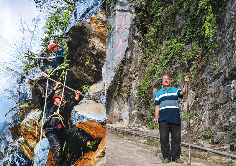 左圖為2008年云南省文山壯族苗族自治州西疇縣巖頭村黨員李華明(下)修路時在懸崖上打炮眼資料照片(西疇縣融媒體中心供圖);右圖為2023年7月26日李華明在修好的出村路上(費茂華攝/本刊)