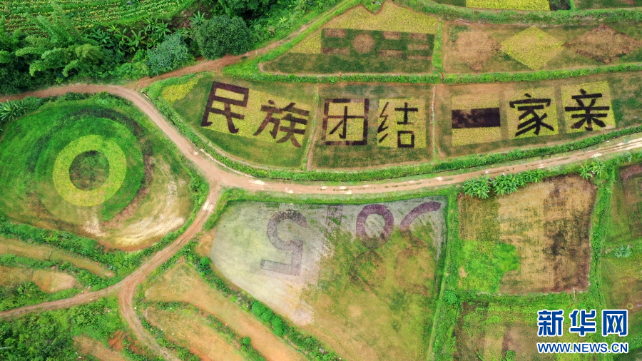 彩色稻田里“民族團結一家親”字樣(8月22日攝)。新華網發(陶平 攝 )