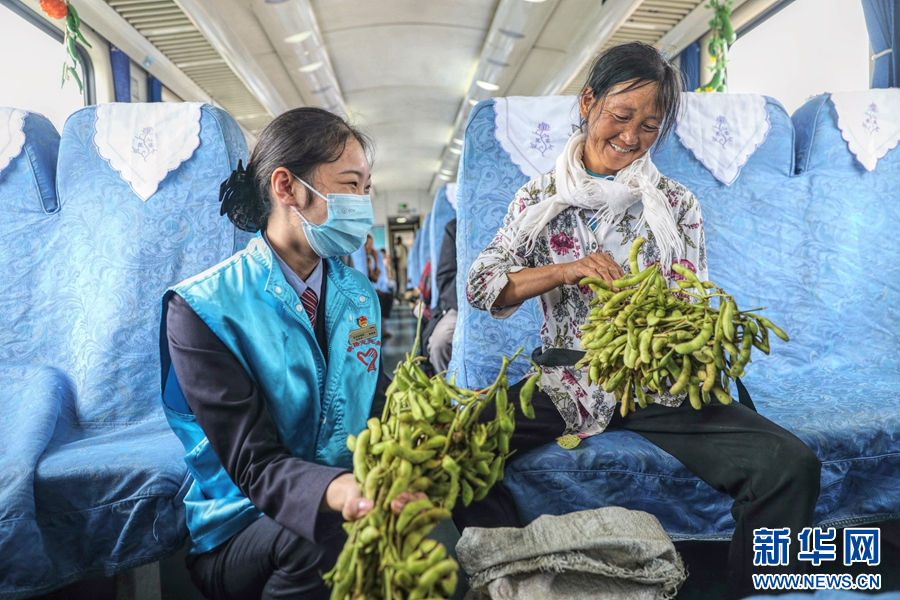 新鮮的瓜果蔬菜,是“慢火車”上的“??汀?,小小的車廂就像一個流動的菜市場,煙火氣十足(攝于8月24日)。新華網發(楊紫軒 攝)