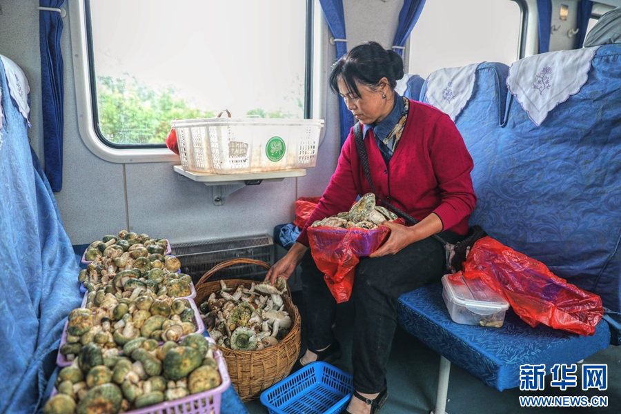 “慢火車”上,一名乘客正在整理擺放自己攜帶的野生菌(攝于8月24日)。新華網發(楊紫軒 攝)