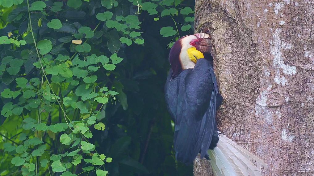 近日,在有“中國犀鳥谷”之稱的云南銅壁關省級自然保護區洪崩河片區,記者記錄到國家一級保護野生動物花冠皺盔犀鳥母子先后出巢的珍貴影像。