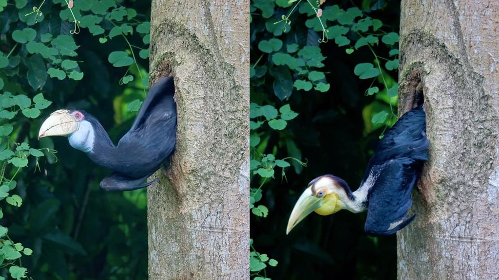 樹巢里的犀鳥寶寶也開始探出可愛的小腦袋,打量著樹巢外的世界。在多次觀察和適應后,犀鳥寶寶也學著媽媽把身體往外擠,經過不斷嘗試后最終飛出了樹巢,在犀鳥父母的帶領下,飛向熱帶雨林深處。