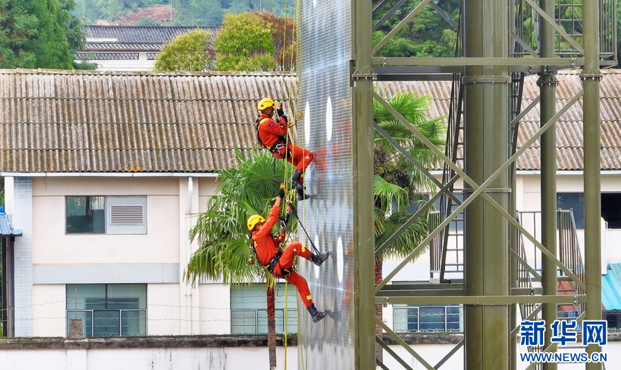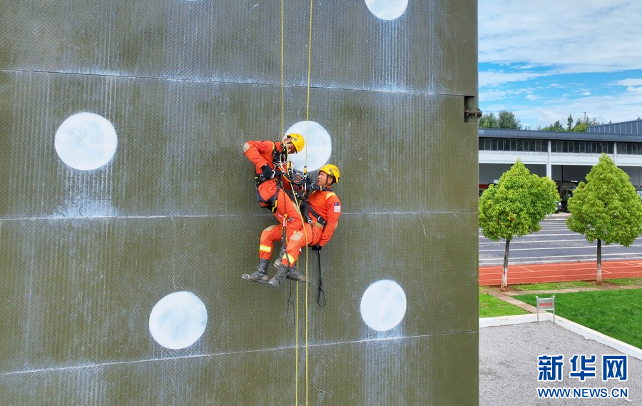 森林消防員在進行繩間救援訓練(9月2日攝)。新華網發(王偉 攝)