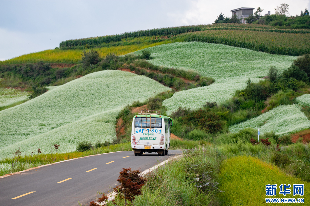 行駛在東川紅土地景區中的城際公交(9月9日攝)。新華網發(鄭益 攝)