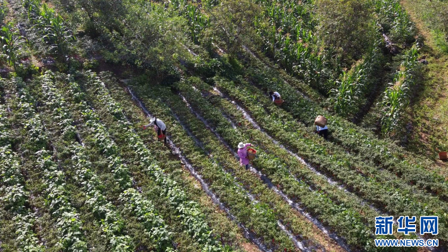 航拍鏡頭下農戶采摘辣椒(視頻截圖)。新華網發(施甸縣融媒體中心 供圖)